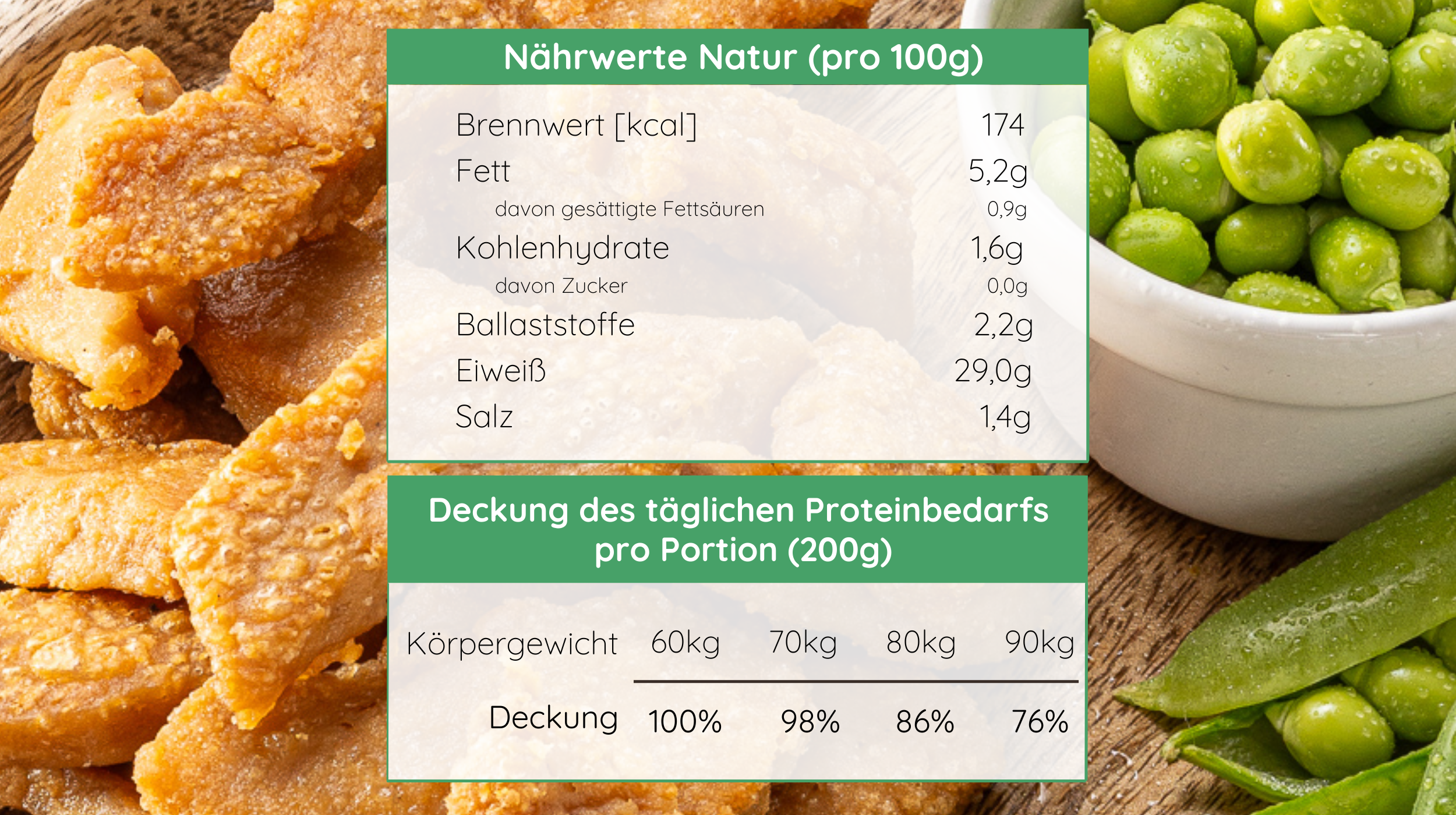 - Chunks Natur: Trinkwasser, Erbsenprotein (35 %), Erbsenfaser, Rapsöl, Salz.