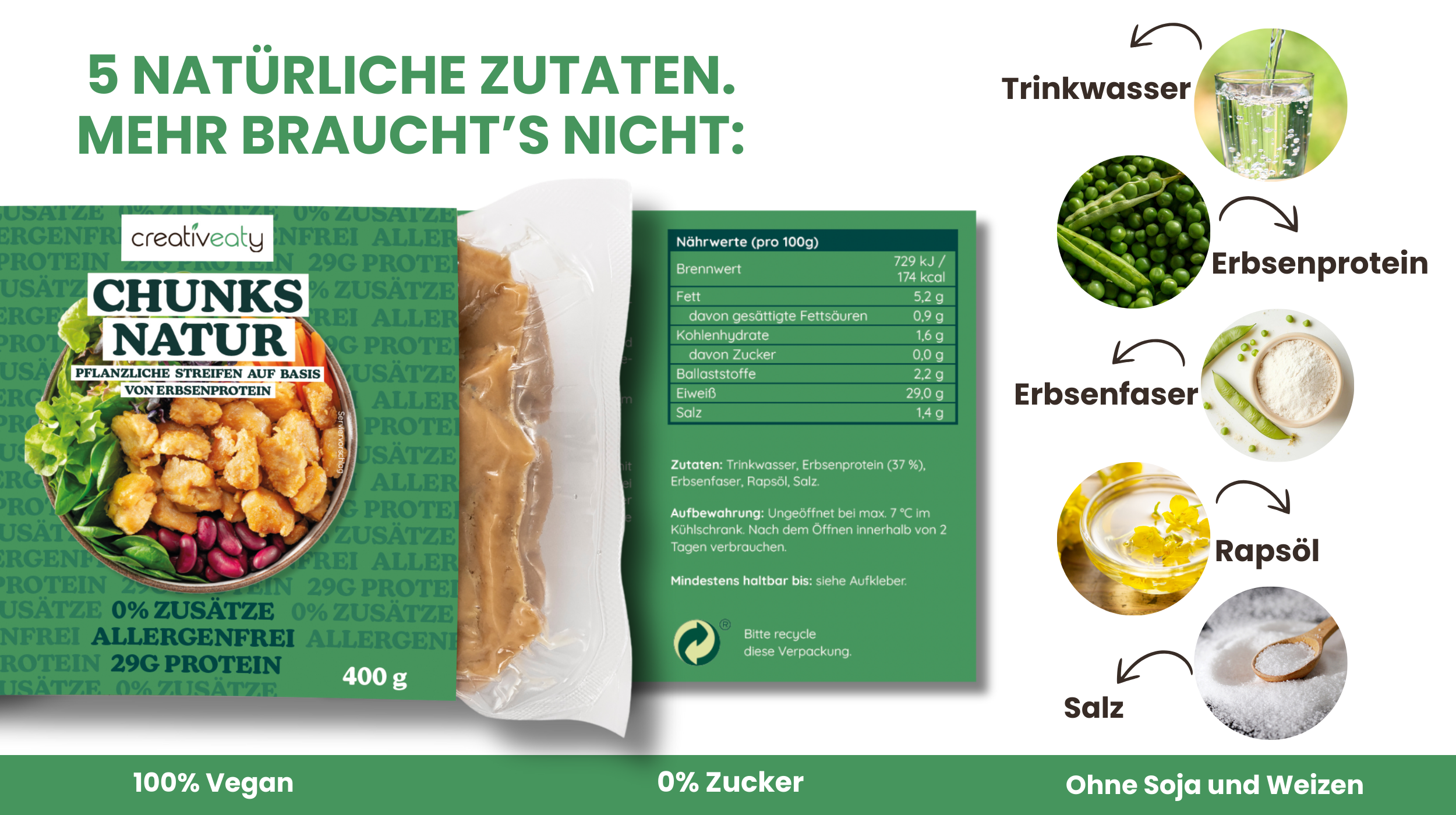 Die High-Protein Chunks haben nur 165 kcal (Natur Variante), 0g Zucker aber dafür bis zu 30 Eiweiß pro 100g. Sie versorgen dich mit hochwertigen Proteinen und halten lange satt, um Heißhungerattacken zu verhindern.