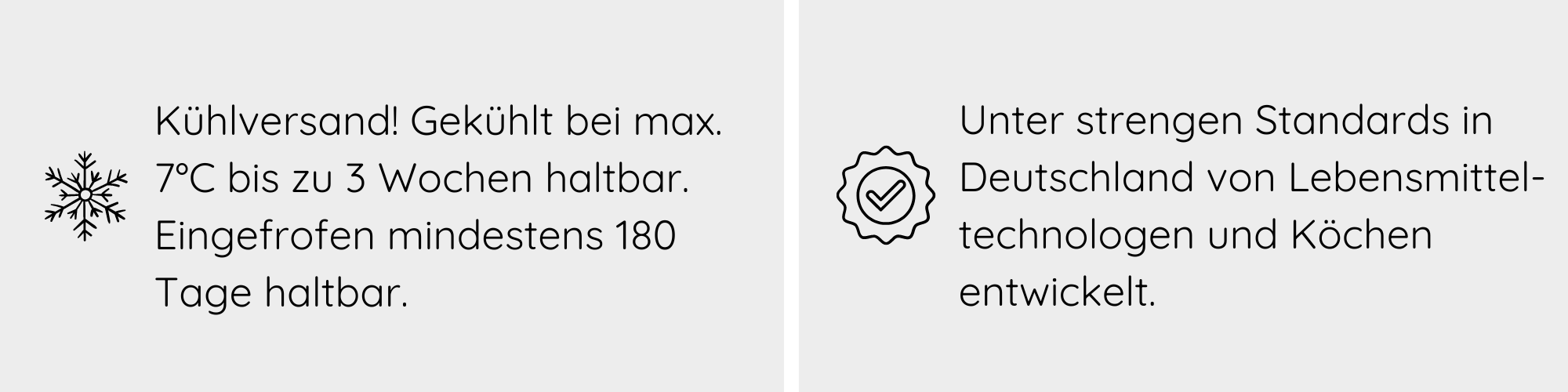 Wir verschicken die Produkte gefroren (mit Isolierbeutel und Eis), so dass sie bei unseren Kunden entweder noch tiefgekühlt oder nur leicht aufgetaut ankommen und du die volle Flexibilität hast. Ob du die Produkte beim Erhalt in den Tiefkühlfach oder in den Kühlschrank stellst, liegt in deinem Ermessen und je nach Verbrauch. Eingefroren können die Produkte 180 Tage im Tiefkühlfach aufbewahrt werden.